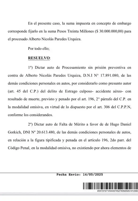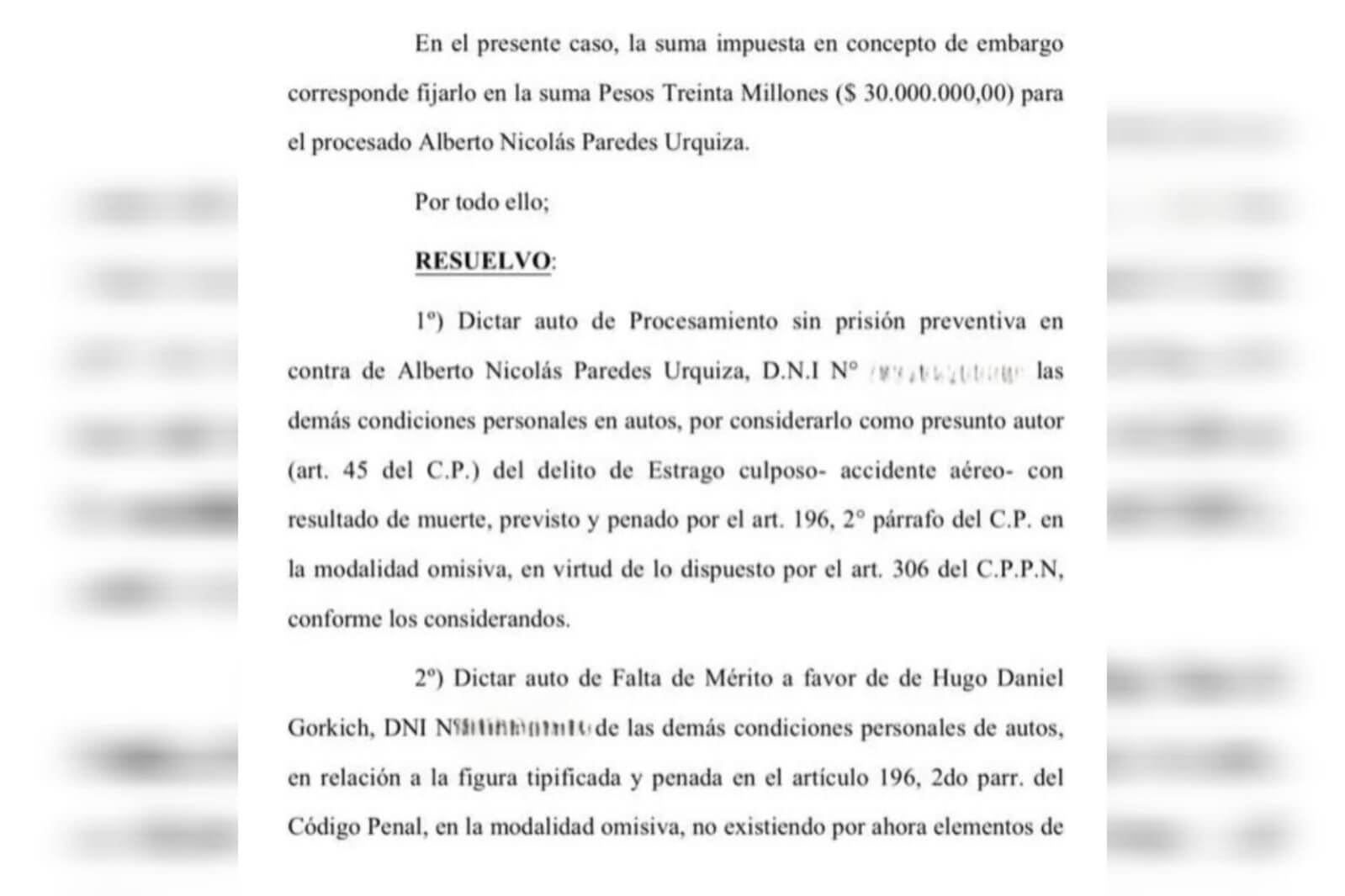 Paredes Urquiza fue procesado sin prisión preventiva, pero el magistrado dispuso un embargo de 30 millones de pesos sobre sus bienes, para garantizar eventuales responsabilidades civiles y las costas del juicio.