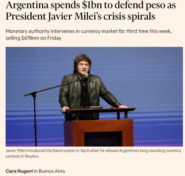 El Financial Times apuntó contra Javier Milei y su plan económico: advirtió que la dinámica cambiaria “no es sostenible” y que la crisis financiera en Argentina se profundiza. Según el medio, el Banco Central vendió u$s1.110 millones en apenas tres jornadas para sostener el peso, en medio de un clima político convulsionado y con crecientes dudas sobre el futuro del esquema.