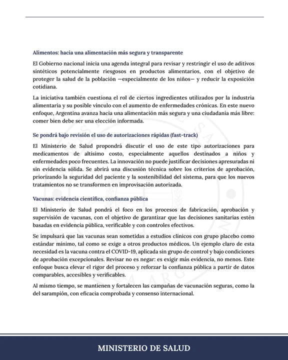 Controles más estrictos para las vacunas: se exigirá evidencia científica rigurosa en procesos de aprobación, fabricación y supervisión de vacunas, con foco en “recuperar la confianza pública”.