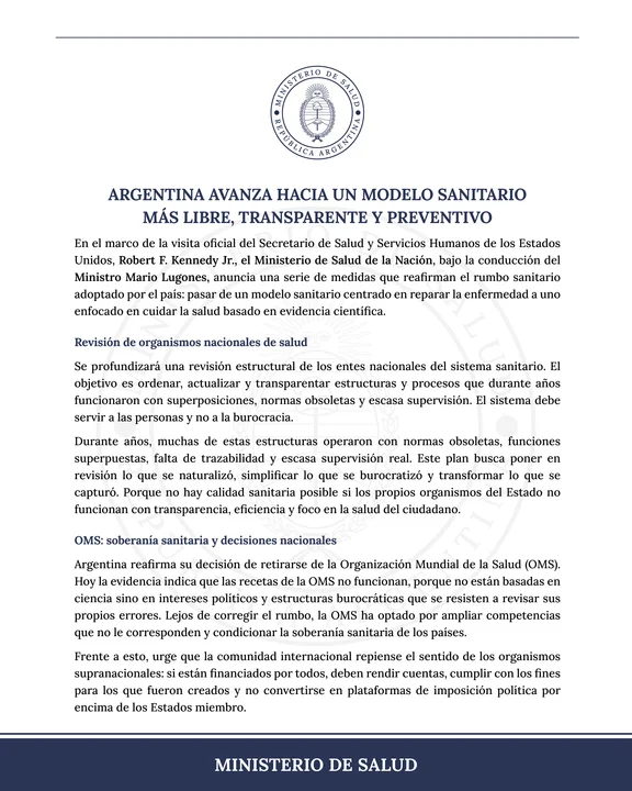 El Ministerio de Salud de la Nación oficializó una profunda reforma del modelo sanitario argentino y anunció el retiro del país de la Organización Mundial de la Salud (OMS), en un comunicado emitido tras la visita oficial del secretario de Salud y Servicios Humanos de los Estados Unidos, Robert F. Kennedy Jr.