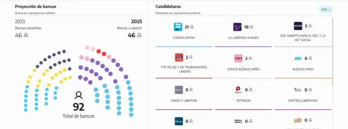 En la Cámara alta, Fuerza Patria llegó a los 24 senadores, asegurándose el control del recinto. La alianza LLA-PRO quedó con 16, mientras que el radicalismo sufrió una derrota histórica, cayendo a solo 3 senadores en el bloque Somos. Unión y Libertad, por su parte, mantiene otros 3.