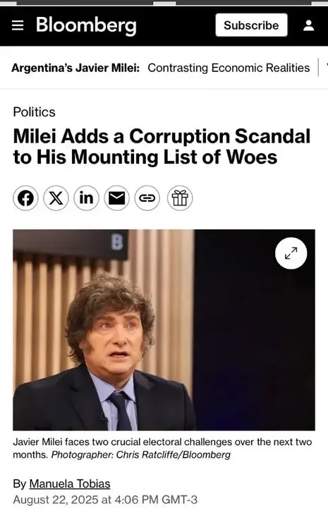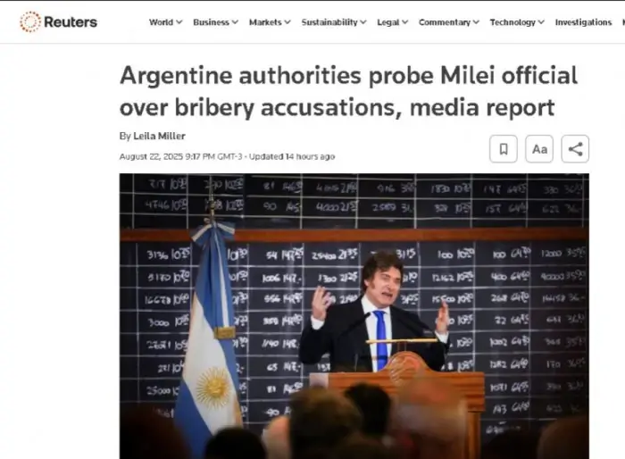 La agencia Bloomberg fue una de las primeras en difundir la noticia a nivel global. En su cobertura, tituló: “Milei suma un escándalo de corrupción a su creciente lista de problemas”. El medio destacó que el episodio se suma a la fractura del bloque oficialista y a la dificultad del Presidente para sostener su plan económico en plena recesión.