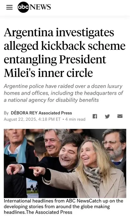 Desde Estados Unidos, ABC News llevó la historia a su portada con el título: “Argentina investiga presunto esquema de sobornos que involucra al círculo íntimo del presidente Milei”.