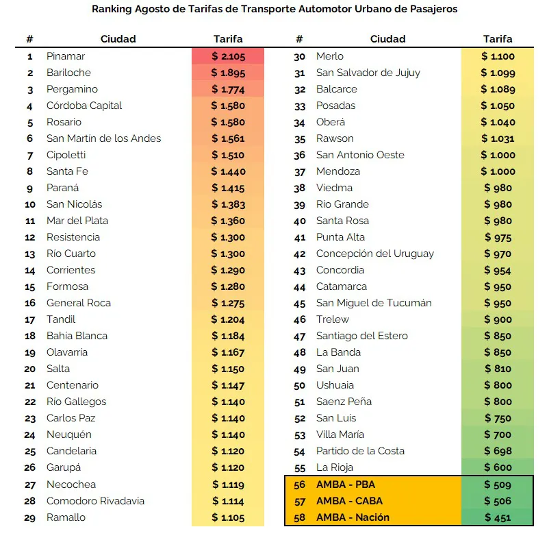 Según el informe de agosto de la Asociación Argentina de Empresarios del Transporte Automotor (AAETA), el pasaje en La Rioja tiene un valor de $600, lo que la coloca en el puesto 55 de un total de 58 ciudades y áreas metropolitanas relevadas. En contraste, la ciudad con la tarifa más alta es Pinamar, donde el viaje cuesta $2.105, seguida por Bariloche ($1.895) y Pergamino ($1.774).