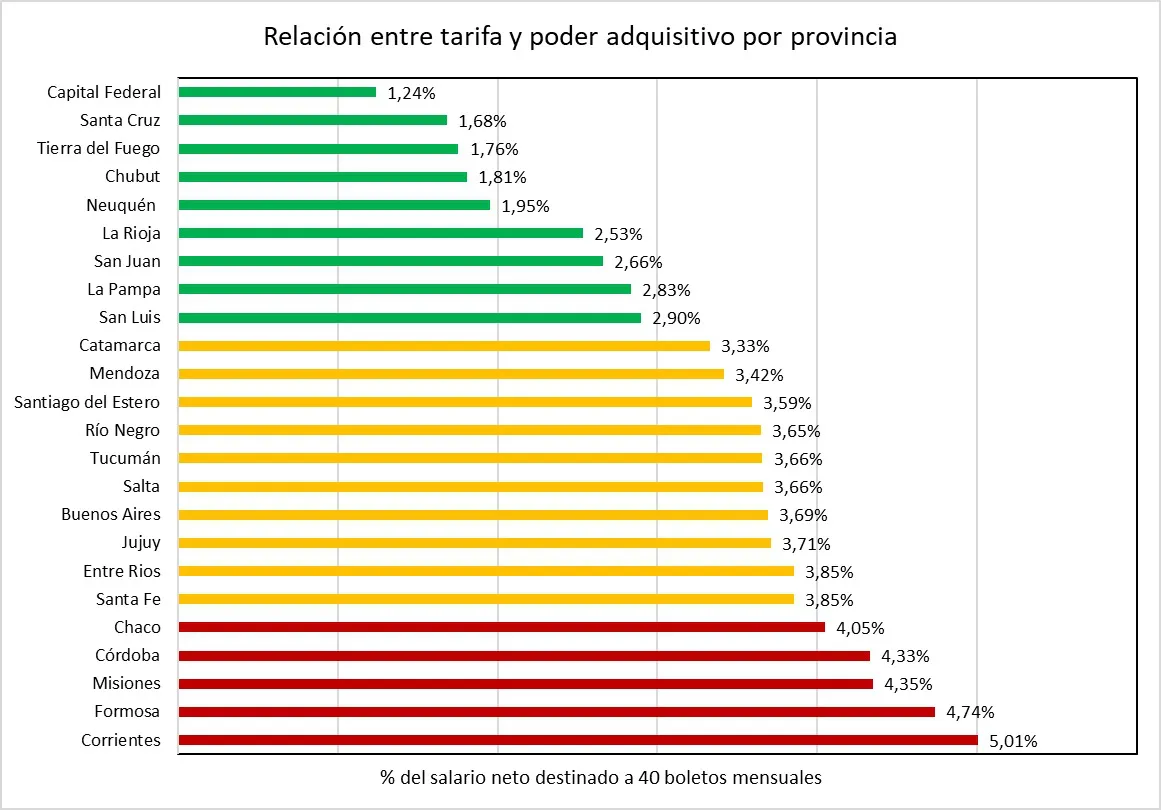 Además del precio nominal, el estudio analiza cómo afecta el costo del transporte al salario neto promedio de cada provincia, calculando el porcentaje del ingreso destinado a 40 boletos mensuales (equivalente a dos viajes diarios durante los días hábiles del mes).