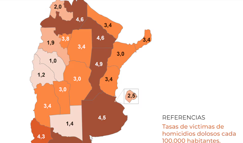 Este dato contrasta fuertemente con la situación de otras jurisdicciones como Santa Fe (4,9), Salta y Chaco (4,6), o Buenos Aires y Río Negro (4,5), que se ubicaron en los primeros lugares en materia de crímenes.