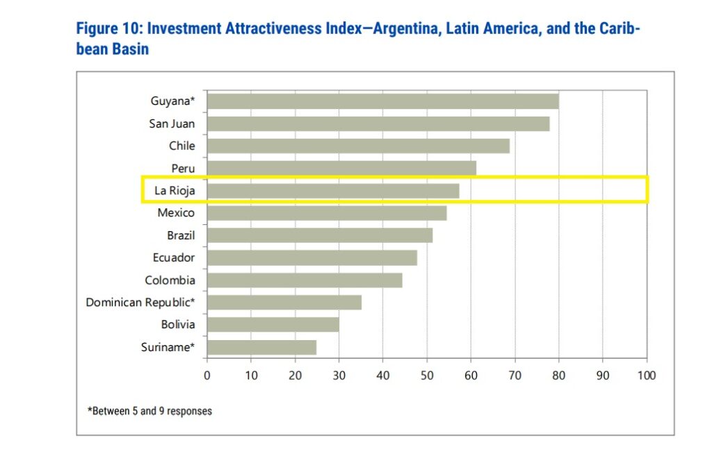 El año pasado, La Rioja había recibido suficientes respuestas para ser incluida en el informe, pero se ubicó como la peor jurisdicción en materia de políticas y una de las menos atractivas para la inversión, ubicándose en el puesto 83 entre 86 jurisdicciones. Esto demuestra el giro que dio la provincia en poco tiempo para revertir esa imagen.