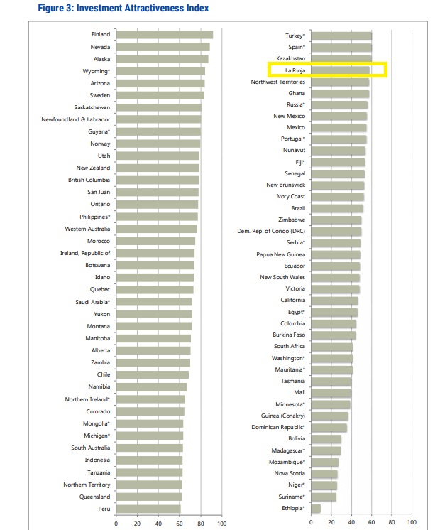 Junto con San Juan, fueron las únicas dos provincias argentinas en aparecer en el ranking que califica a las jurisdicciones más atractivas para invertir, no solo por su potencial geológico sino por las políticas gubernamentales que favorecen o disuaden la inversión.