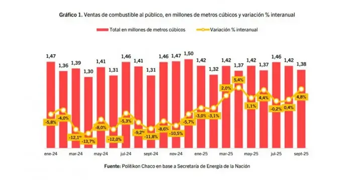 La venta de combustibles en Argentina cayó por segundo mes consecutivo. De acuerdo con datos de la Secretaría de Energía procesados por Politikon Chaco, en septiembre se vendieron 1.376.837 metros cúbicos, un 3,1% menos que en agosto, tras la baja del 2,9% del mes previo.