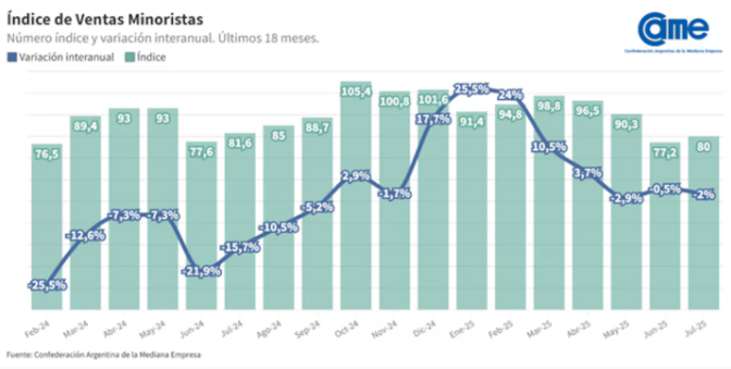 Las ventas minoristas pymes registraron una caída del 2% en julio respecto del mismo mes de 2024, según el Índice de Ventas Minoristas (IVM) de la Confederación Argentina de la Mediana Empresa (CAME).