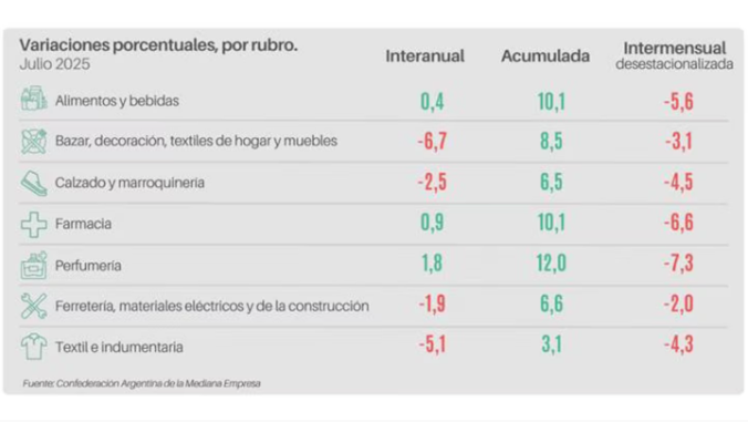 De los siete rubros relevados por CAME, solo tres mostraron aumentos interanuales en julio: “Perfumería” (1,8%), “Farmacia” (0,9%) y “Alimentos y bebidas” (0,4%). Los cuatro restantes registraron caídas, lideradas por “Bazar, decoración, textiles para el hogar y muebles” (-6,7%), “Textil e indumentaria” (-5,1%), “Calzado y marroquinería” (-2,5%) y “Ferretería, materiales eléctricos y de la construcción” (-1,9%).